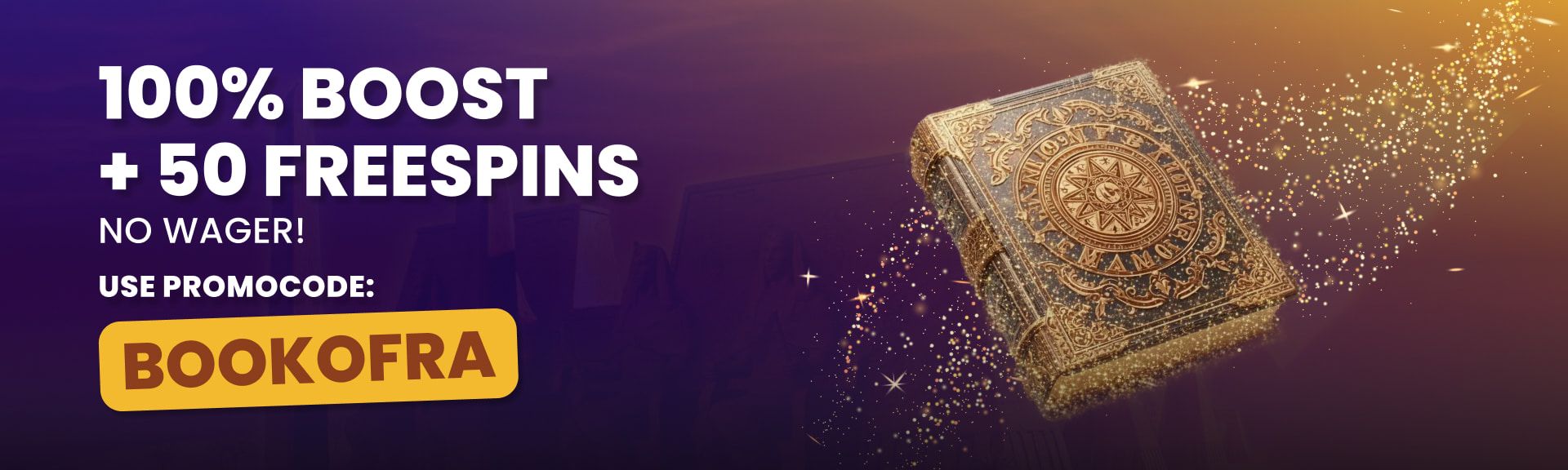 Code BOOKOFRA is designed for players who want maximum value from every deposit. Get a 100% deposit bonus up to €500 on deposits from €20, and if you deposit €50 or more, enjoy 50 Free Spins on Book of Ra on top.